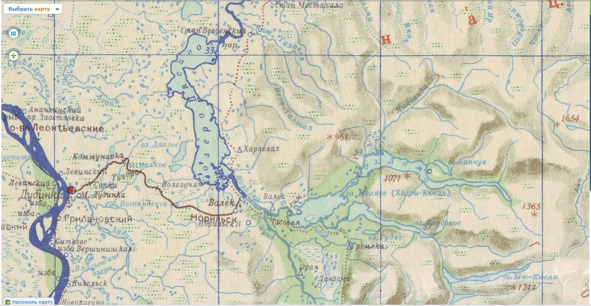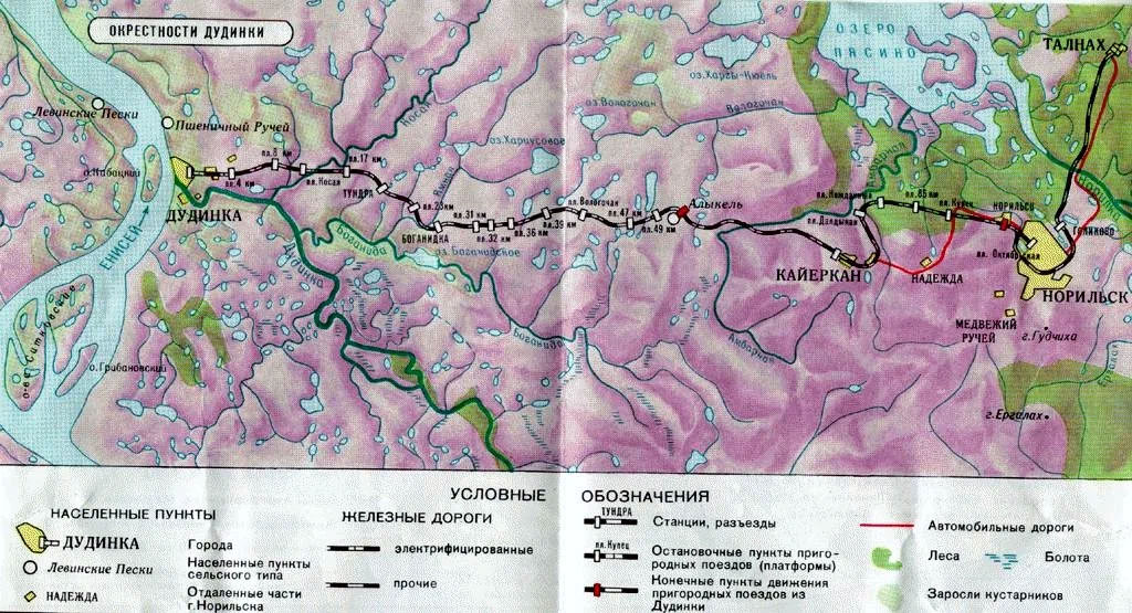 Тот же участок местности между Дудинкой и Норильском на схеме 1970х годов.