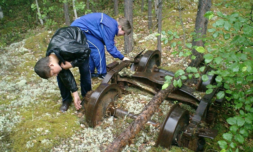 Студенты обследуют узкоколейку, построенную ссыльными литовцами в 1951 году