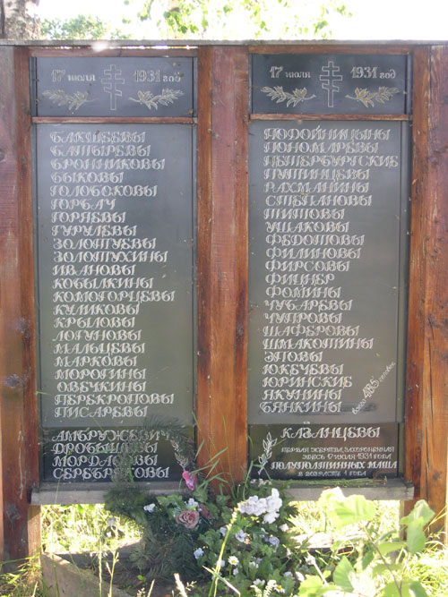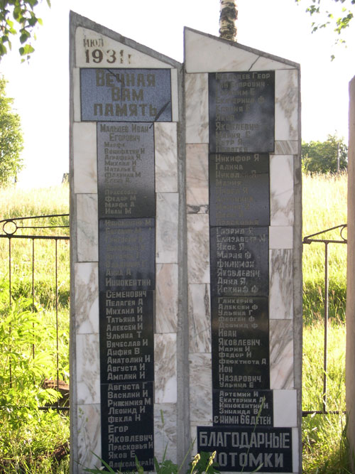 Теперь снова воспоминания Ии Николаевны: «Об освящении и официальном открытии памятника 17 июля 1996 года много рассказано другими. Напомню лишь фамилии тех, кто присутствовал: Золотухины, Мальцевы, Писаревы, Марковы, Лихацкие, Голобоковы, Якунины, Комогорцевы, Бельман, Путинцевы, Титовы, Ждановы и многие другие. На следующий день, 18 июля, были установлены стелы с фамилией Мальцевы и их именами, что, по моему убеждению, никак не соответствует истине: получается, что сосланы были только Мальцевы. 22 июня 1997 года Константин Васильевич Комогорцев и Анатолий Иннокентьевич Голобоков установили две стелы, на которых высечены 50 фамилий репрессированных. Справедливость восстановлена».