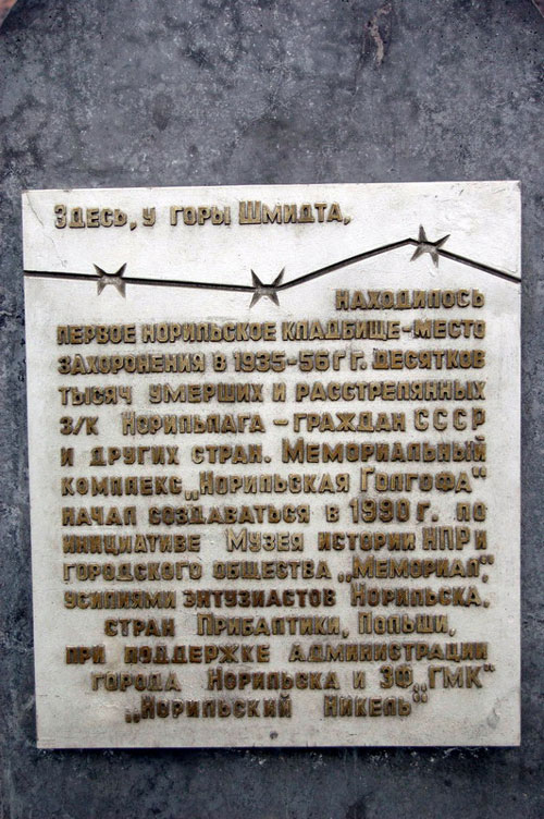 Гранитная стела с информационной доской. Надпись: "Здесь, у горы Шмидта, находится первое норильское кладбище - место захоронения в 1935-56 гг. десятков тысяч умерших и расстрелянных заключенных Норильлага - граждан СССР и других стран. Мемориальный комплекс "Норильская Голгофа" начал создаваться в 1990 г. по инициативе Музея истории НПР и городского общества "Мемориал", усилиями энтузиастов Норильска, стран Прибалтики, Польши, при поддержке администрации города и ЗФ "ГМК" "Норильский никель".