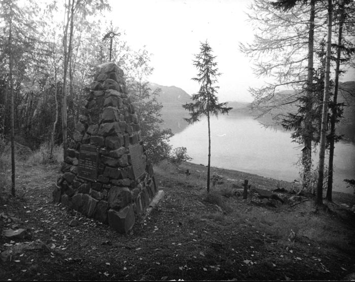 Надпись: "Сюда, на озеро Лама, в 1941 - 1945 гг. были сосланы сталинскими палачами офицеры артиллерийских войск высшего ранга Литвы, Латвии и Эстонии" (на русском и английском языках). Ниже - имена погибших офицеров.