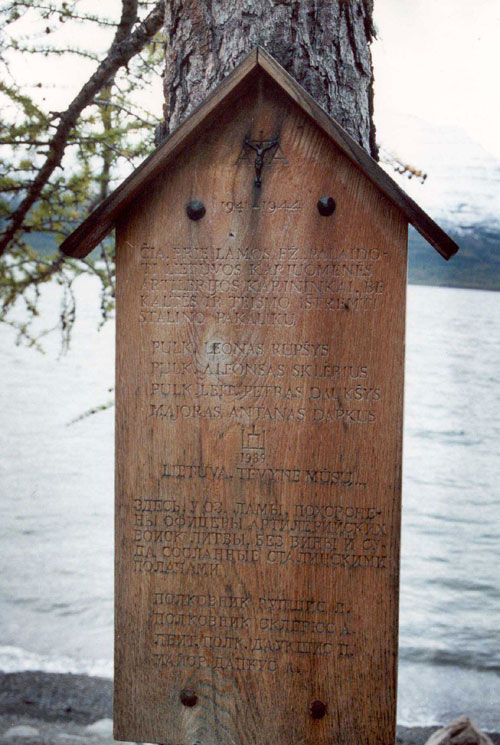 Тогда же была установлена стилизованная часовенка с распятием в верхней части и с надписью: "1941 - 1944 гг. Здесь, у озера Лама, похоронены офицеры артиллерийских войск Литвы, без вины и суда сосланные сталинскими палачами" (на литовском и русском языках). Ниже - имена погибших