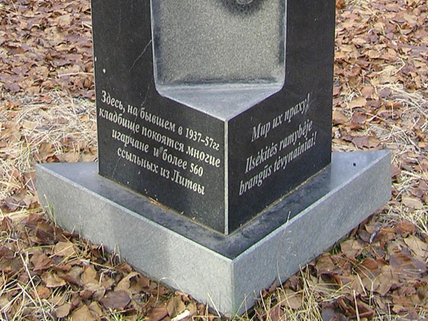 На бывшем литовском кладбище установлен памятник жертвам массовых репрессий. Памятник изготовлен по заказу Вильнюсского общества бывших политзаключённых и ссыльных литовцев. Размеры: 100 х 50 см (форма в поперечном сечении – треугольная). Материал: чёрный полированный гранит. Постамент – плоский треугольник высотой 12 см, размеры 76 х 40 см. Памятный знак установлен в августе 2001 г. Освящён ксёндзом в 2002 г.
