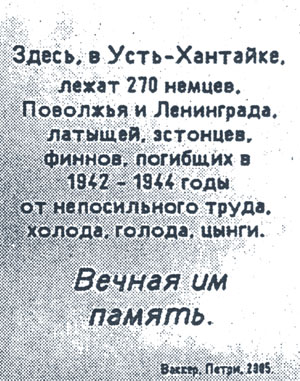 В июне 2006 года на Таймыре установлен памятный крест с надписью на плате: "Здесь, в Усть-Хантайке лежат 270 немцев Поволжья и Ленинграда, латышей, эстонцев, финнов, погибших в 1942-1944 годы от непосильного труда, холода, голода и цинги. ВЕЧНАЯ ИМ ПАМЯТЬ. Ваккер, Петри, 2005."