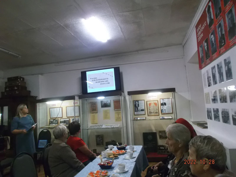 Работники районной библиотеки участникам встречи представили мультимедийную презентацию «Память как осколок в сердце» и рассказали об А..И.Фроловой - председателе районной комиссии по розыску репрессированных граждан, а также представили книжную выставку ««Память стой! Замри! Это было!».