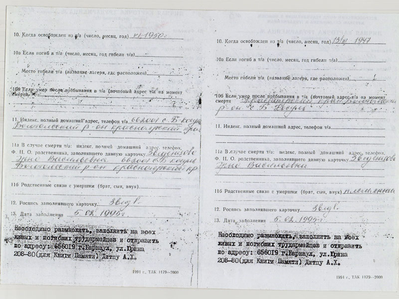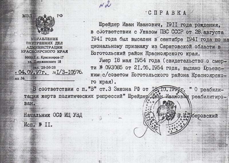 Когда проезжали соседнее село, то видели, как в опустевших домах орудовали мародеры. По дороге в эшелоне умерли брат и сестра моего дедушки 1937 и 1939 года рождения. Сибирь встретила спецпереселенцев сурово. Стоял холодный сентябрь 1941 года. Две недели ютились в клубе. Потом стали обживаться кто как мог: кто-то копал землянку, а кто-то шёл на квартиру, отдавая всё, что имели самое ценное, чтобы прокормиться...» (Приложение № 2 Справка)