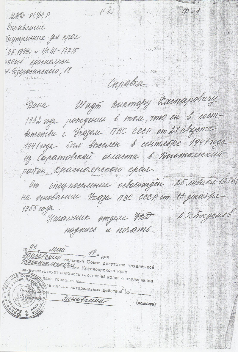 Я являюсь внуком переселенца немецкой национальности Шадт Виктора Каспаровича 1932 года рождения, вывезенного в августе 1941 года в возрасте 9 лет из села Красный Яр Красноярского района Саратовской области. В селе, где я живу, таких семей 248, поэтому тема моей исследовательской работы вовсе не случайна и актуальна: чтобы уважать историческое прошлое нашей Родины, необходимо его изучать, исследовать причины произошедшего, а я и моя семья и есть часть нашей Родины. Я узнал, что в нашем крае проводилась поисково- исследовательская акция «Красноярский край в годы репрессий», посвященная дню памяти жертв политических репрессий и понял, что это именно то, о чем мне хочется узнать больше и поделиться своими исследованиями с другими, ведь эта тема касается не только меня лично. Я узнал, что разработана государственная программа «Патриотическое воспитание граждан Российской Федерации на 2006-2010 годы, утвержденная постановлением Правительства РФ от 11 июля 2005 года