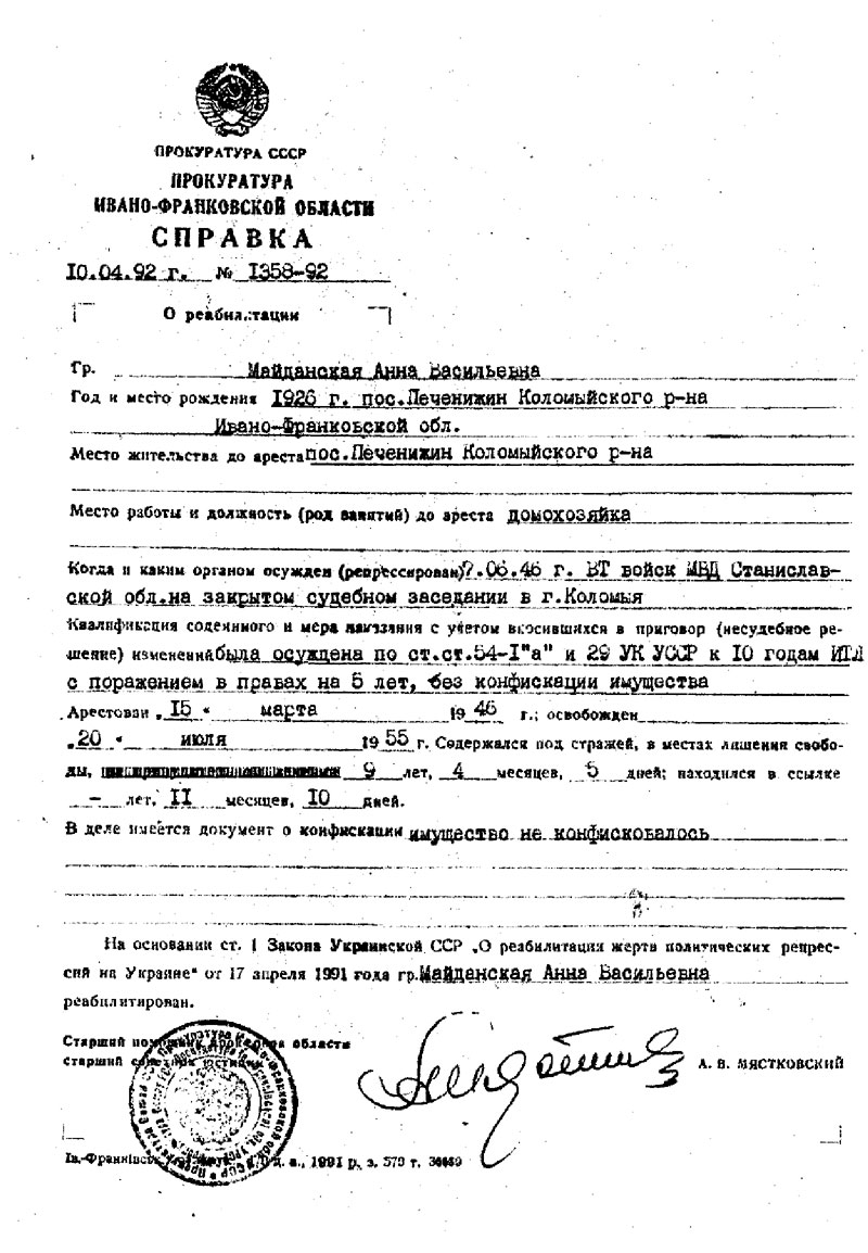 В июне 1946 года уроженка села Печенежнина Ивано-Франковской области Анна Васильевна Майданская перестала существовать как человек, личность, гражданин.