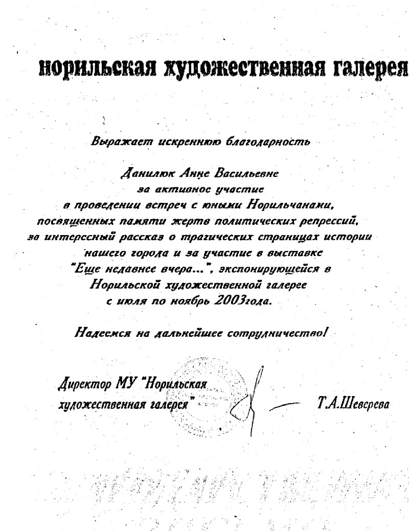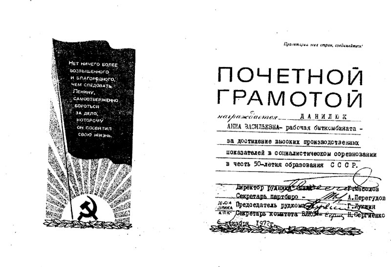 Данилюк Анна Васильевна имеет большой трудовой стаж. Её многолетний труд отмечен грамотами и благодарностями руководства Норильского комбината и др. организаций города (Приложение 5-10).
