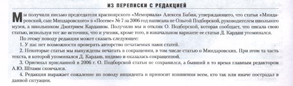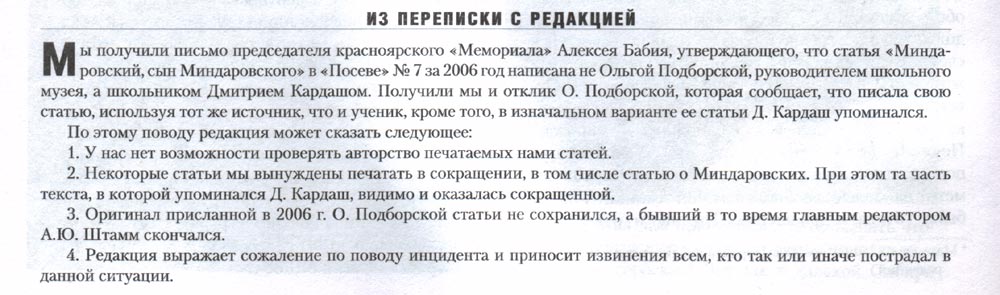 Эта работа была в числе победителей конкурса "Человек в истории. Россия - ХХ век" в 2002 году. Однако в 2006 году она появилась в журнале "Посев" с незначительными изменениями и сокращениями и под фамилией Ольги Подборской. Мы хотели бы восстановить справедливость: именно Дмитрий Кардаш из г. Енисейска является настоящим автором этой работы - она зарегистрирована под номером 2428 на третьем конкурсе "Человек в истории. Россия - ХХ век" в Международном обществе "Мемориал". Мы полагаем, что юридическая и моральная оценка ситуации достаточно ясна, однако хотели бы получить комментарии от редакции уважаемого журнала "Посев".