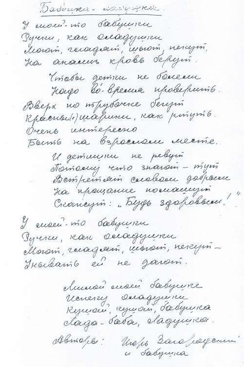 Такая вот она, Э.Н.Загородская, одна из самых-самых старожилов Кайеркана. Скромная, добросовестная, всю жизнь с кучей общественных поручений. Мягкая, «домашняя». Прекрасная мать, отличная бабушка. Занимаясь с внуками, она непросто ухаживала, а старалась интересно разнообразить занятая с ними. Подтверждением тому стихотворение, которое она написала с внуком Игорем, читая которое нельзя остаться равнодушным.