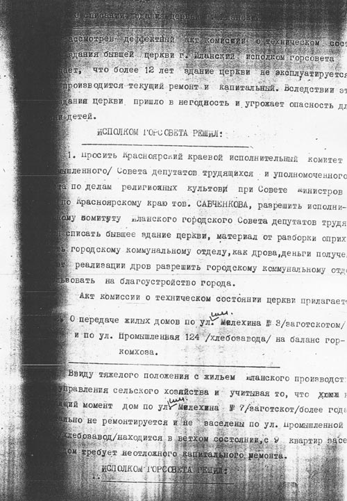 1. Удовлетворить просьбу городского Совета просить крайисполком и уполномоченного Совета по делам религиозных культов по Красноярскому краю тов.Ермилова разрешить произвести ремонт здания бывшей церкви с дальнейшим размещением в нем Добровольного общества содействия армии, авиации и флота ДОСААФ.