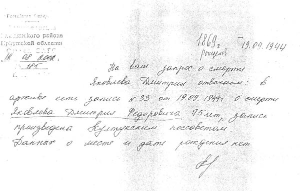 Яковлев Дмитрий Федорович прожил 75 лет, о чем свидетельствует ответ на наш запрос отдела ЗАГС Слюдянского района Иркутской области от 12.08.2002 года № 185 (фото 18).