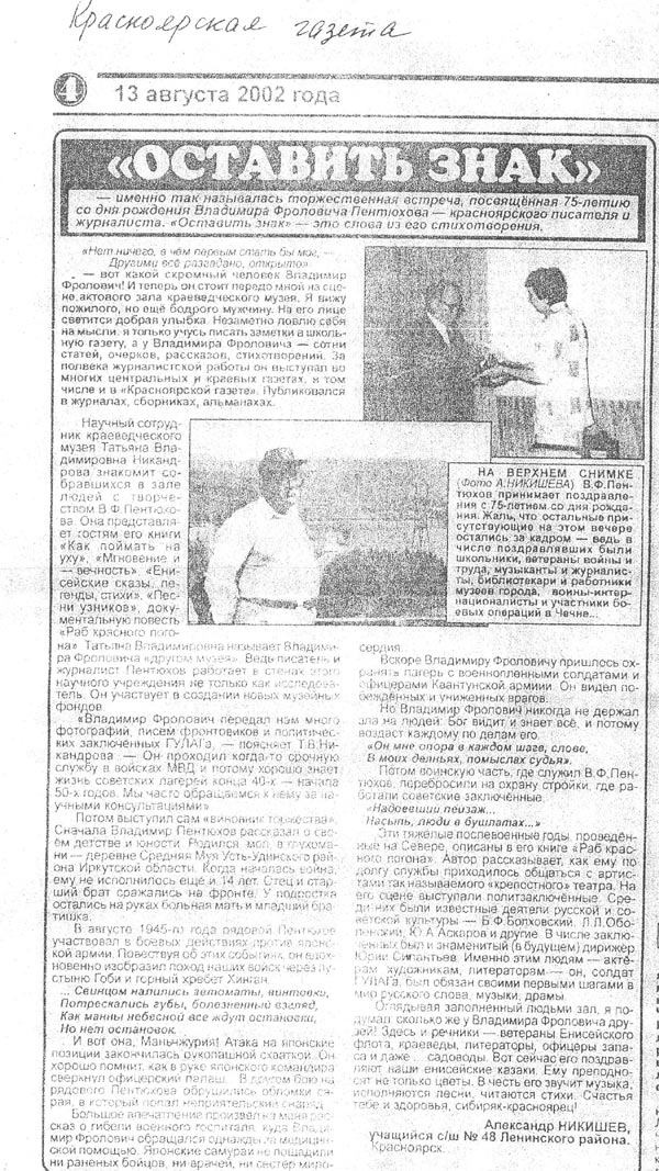 Я веду поиск достойных и интересных людей, оформляю о них в музее стенды, пишу заметки в школьную газету «Остров Мы», в городские газеты, например, про писателя Пентюхова Владимира Фроловича в «Красноярскую газету» (Приложение 15), участвую в творческих конкурсах, в одном из которых, «Служить родному городу», занял первое место (Приложения 16-18).