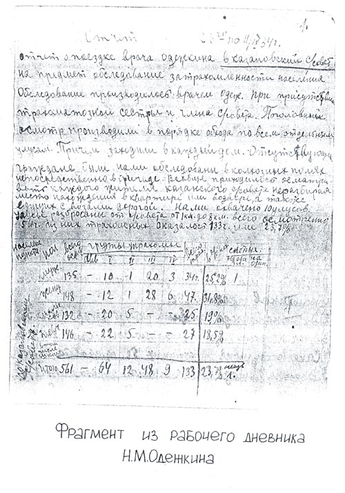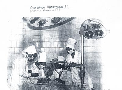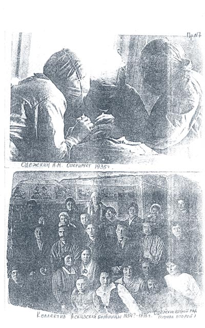 Разговор продолжает Нагрузова З.Г.(Приложение № 20): «Приезжаем в село. Идем в пункт. Оповещают население. Народ кто идет, а кто-то и прячется. Боялись, больно было. Мы их уговариваем. Мол смотрите, ничего у нас нет: ни иголки, ни ножа, не бойтесь! Приходилось приглашать милиционера на помощь. Жили в фельдшерском пункте. Хорошо, если местная медсестра подкормит молоком, картошкой. Сам Одежкин работал с 7 утра до 10 вечера. Читал лекции, осматривал больных, тут же оперировал, писал ходатайства.
