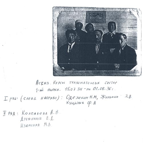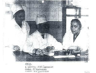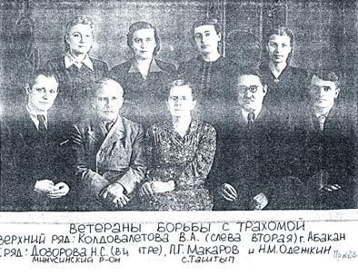 «Как это было? - вспоминает Саражакова З.А. - Когда я фельдшерицей работала в детском отделении в 1948 г., меня пригласила зав. кадрами и в приказном порядке отправила работать санинструктором в трахоматозный диспансер. Там впервые увидела Николая Максимовича, раньше его не знала. Он с радостью меня приветствовал: «Вот молодец, что ты пришла. Давай работать вместе, хакасов своих будем лечить от трахомы». Позднее пришли Вяткина Лидия Кирилловна, Хохлова Нина Алексеевна. Тогда и решил Николай Максимович создать выездную бригаду по области. Вчетвером выезжали в Аскизский район, он был самый неблагополучный. Ходили из дома в дом, из дома в дом. Проверяли, искали эту трахому. Конечно, было много, очень много больных. Слепые старики, а у членов их семей глаза были настолько заплывшие гноем, что страшно было смотреть. Но как говорят: «Глаза боятся, а руки делают». Почему же так было? Трахома передавалась через полотенце. Санитарии не было в семьях. Вытирались грязной тряпкой. Каждый умоется, этой же тряпкой вытирается. Второй. Третий. И таким образом они сами себя заражали. В таких условиях Николай Максимович решил закрепить каждую из нас за определенным районом.