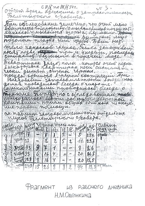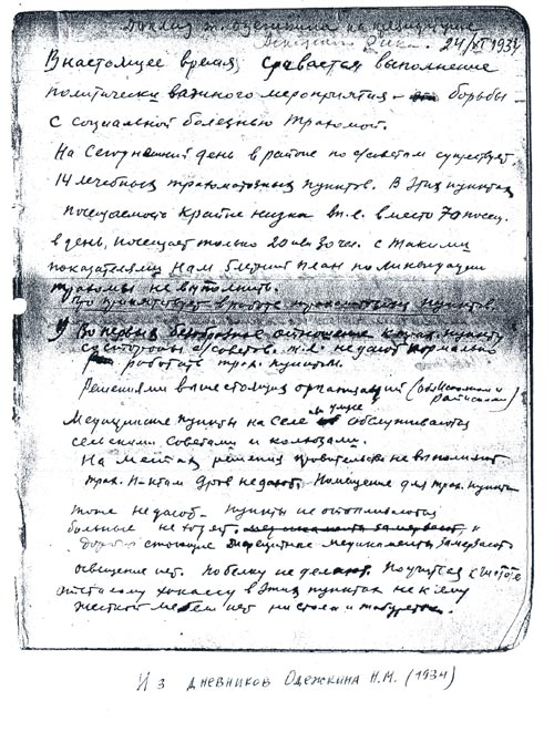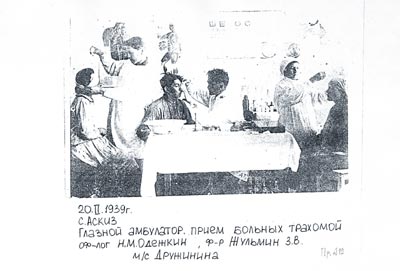 «В настоящее время срывается выполнение политически важного мероприятия - борьбы с социальной болезнью трахомой. На сегодняшний день в районе по сельским советам существует 14 лечебных противотрахоматозных пунктов. В этих пунктах посещаемость крайне низка. Вместо 70 посещений в день, посещают только 20 или 30 человек. С такими показателями нам 5-летний план по ликвидации трахомы не выполнить. На местах решения правительства не выполняют. Трахоматозным пунктам дров не дают, пункты не отапливаются, дорогостоящие дефицитные медикаменты замерзают. Освещения нет. Побелку не делают. Жесткой мебели нет ни стола, и табуретки!» (24.11.1934 г). (Приложение № 14, 15)