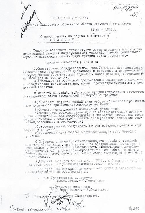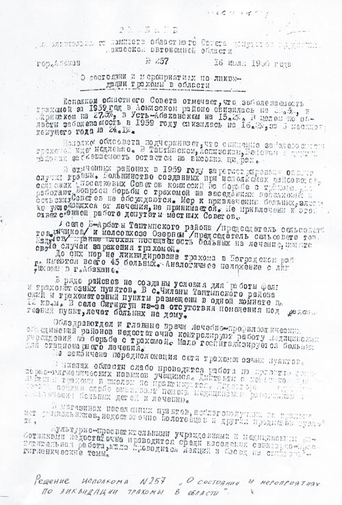 Тема совещания: «ОБ усилении борьбы с трахомой в области». Вспоминает Шалгинова А.И. (Приложение № 23): «Токмашова Нина Ивановна, заведующая райздравотделом в Аскизе, предложила организовать летние лагеря призывников, где бы их не только готовили к армии, но и одновременно и лечили. Вся общественность несла ответственность за борьбу с трахомой, начиная от председателя сельсовета до депутатов всех уровней. Всем медицинским учреждениям вменялось задание вылечивать определенное количество больных и следить за ними до их полного выздоровления. По всем организационным мероприятиям с 1948 по 1962 годы хакоблисполком ежегодно принимал соответствующие постановления. Всего их было принято 15. (Приложение № 24)
