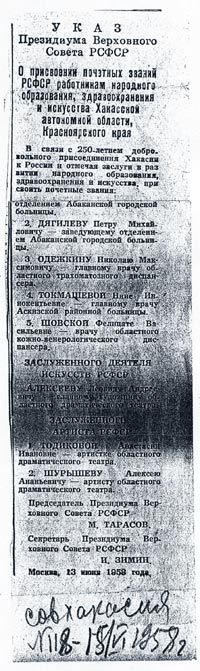 присвоят звание заслуженного врача РСФСР» (Из истории Хакасии. Советский период