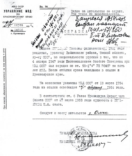Мой дед, Кирьянов Николай Филимонович, ушёл на войну в 20 лет. При освобождении населённого пункта (он не помнит название) их батальон попал в окружение. Он был ранен и попал в плен. Два раза пытался бежать. Первый раз неудачно. Его и товарищей немцы догнали и стали травить собаками. Второй раз повезло. После воевал в штрафном батальоне. Победу встретил в госпитале. Отношение к пленным при сталинском режиме было ужасным. В самом начале войны, 16 августа 1941 года, был подписан приказ, в котором говорилось, что командиры и политработники, сдавшиеся в плен, считаются дезертирами, а их семьи подлежат аресту. Семьи попавших в плен красноармейцев лишались государственной помощи и пособий. В условиях войны эти положения распространялись фактически на всех, кто считался пропавшим без вести.