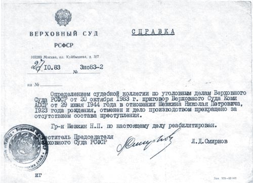 В 1983 Шевкина реабилитировали, после того как он в 1963 году сделал запрос в военный трибунал.