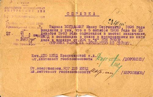 Учитель истории дала нам задание: собрать всевозможные данные об участии членов семьи в войне. Причем упор делался на чисто бытовые, «житейские», подробности. По программе мы еще не проходили саму Великую Отечественную войну, поэтому жанр работы изначально планировался как «эссе», а не реферат. Сам фактический материал, связанный с участием моего прадеда в войне, подбирался с помощью учителя, на основании семейного архива. В процессе работы возникла идея попытаться проследить довоенную биографию Богдашина И.С. по архивным документам. Более того, я получила даже отношение в Государственный архив Красноярского края (в сопровождении учителя, разумеется). Но в архиве мне не то чтобы отказали, а объяснили, что мне еще не могут доверить работу с некоторыми документами. Папа сказал, что для того, чтобы писать биографию моего прадеда, нужно проводить многомесячное, специальное исследование. Нужно просмотреть большое количество источников и литературы и, самое главное, в процессе изучения конкретных боевых операций, потеряется, отойдет на второй план судьба конкретного человека, бойца Красной Армии Богдашина Ивана Сергеевича.