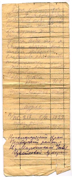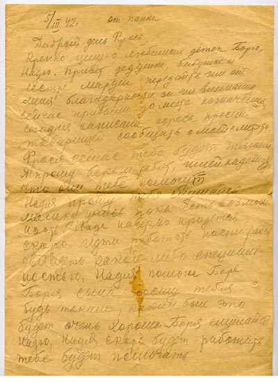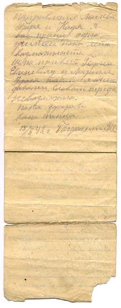 Добрый день Фрося. Крепко целую любимых деток Борю и Надю. Передайте привет сестре Марусе, дедушке, бабушке. Передай им от меня что я их очень благодарю за их ……. В которых очень большая нужда в дороге кормят очень ограничено, запасы все вышли. Сечас скучна ожидать кусок хлеба! Как едем ты сама видела как нас нагрузили. Все время мороз. Сечас скоро будем в городе Молотове. За всю дорогу на станциях купить совершенно нечего. Ехали мы по разговорам до города Омск где должны стоять 10-15 дней. Оказалось нетак. Сечас предполагаем пряма на фронт. Направление Москва. Боря и Надя. Я вас прошу одно, учитесь пока есть возможность.