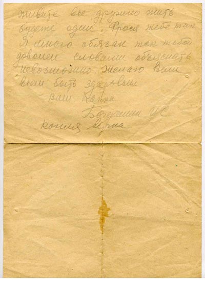 Добрый день Фрося. Крепко целую любимых деток Борю, Надю. Привет дедушке Бабушке привет сестре Марусе. Передайте им от меня благодарность за их внимание. Привет Георгею, Марине. Фрося я сдороги писал 5 писем. Сечас прибыли до места. Сегодня написали адреса просим товарищей сообщить о моей смерти. Фрося сечас тебе будет очень тяжело. Я прошу береги ребят, имей надежду что они тебе помогут.