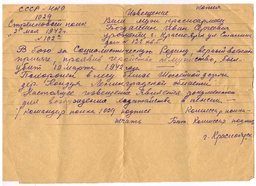Когда я спросила папу, почему на т.н. «похоронке» написано копия, и почему моя (незнакомая мне) прабабушка не сохранила подлинник – он не смог сразу ответить. Потом мы вместе с ним разобрались. Он не смог ответить, потому что он не жил в то время, когда подобный документ являлся «основанием…для предъявления в соответствующие государственные органы для получения соответствующих документов. Имеются в виду карточки, талоны, справки для получения пособий и т.п. (Приложение, № 15.)