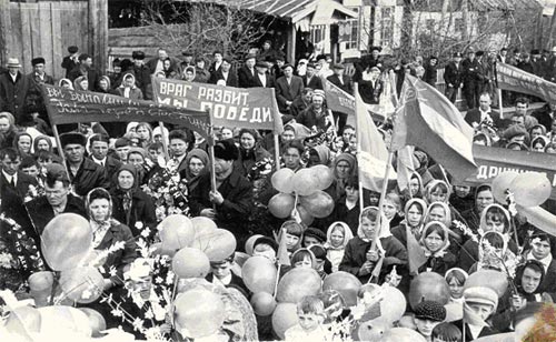 Через несколько дней население деревень собралось на митинг посвященный Дню Победы. Главную идею митинга характеризовали лозунги : «Враг разбит, мы победили», «Мы выполнили свой долг перед Родиной» и другие. Несмотря на то, что повсюду были цветы, шары, украшенные ветви деревьев, но на фотографии немного улыбающихся людей – это был праздник со слезами на глазах.