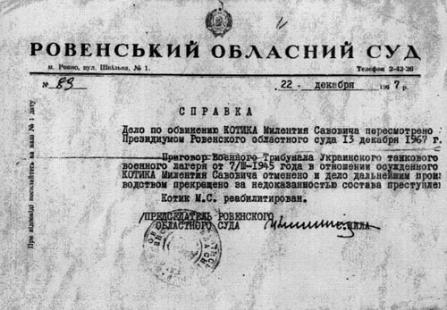 13 декабря 1967 г. дело по обвинению Котика Милентия Савовича было пересмотрено. Приговор Военного Трибунала отменен, дело прекращено за не доказанностью состава преступлений. Котик М.С. реабилитирован.