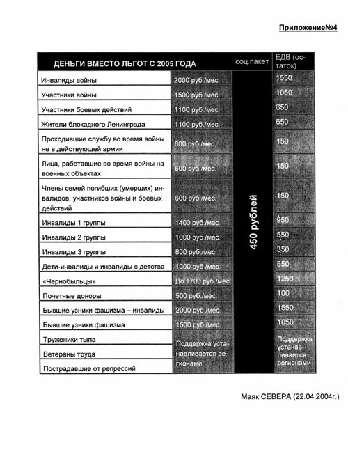 Депутаты и сенаторы приняли закон о замене льгот деньгами, который вступит в силу 1 января 2005 года. Льготы Героям Советского Союза, России, Социалистического Труда и полным кавалерам ордена Славы и Трудовой Славы решено пока не отменять. Депутаты сохранили северные коэффициенты, а северным пенсионерам - право на бесплатный проезд к месту отдыха один раз в два года. Так называемый соц. пакет - 450 рублей - будет каждый месяц вычитываться из суммы, полагающейся льготнику. Инвалиды войны получат на руки не 2000 руб., а 1550 руб., почетные доноры не 500, а 50 и т.д. С 2006 года ветераны получат возможность выбирать, что для них лучше - льготы или деньги (Приложение № 4).