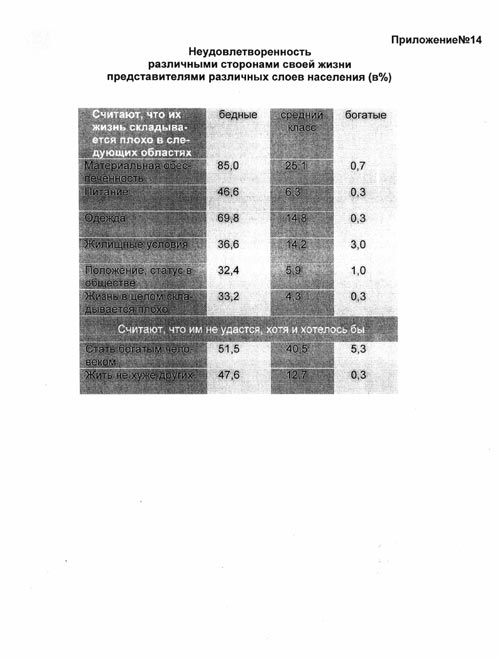 Я провела опрос, который показал, что люди, проживающие за чертой бедности, хотят, чтобы их заработная плата, пенсия, пособие по безработице были увеличены вдвое. Люди со средне-стабильным доходом хотят увеличения своего «заработка» в 3,4 раза. Чем доходы человека выше, тем выше его потребности и желания (сравните с данными по всей России - Приложение № 14).