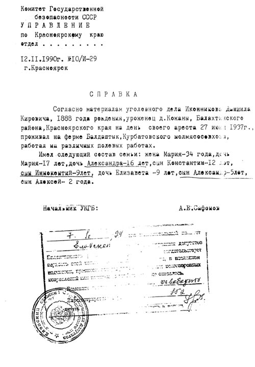 Из архивных документов нам стало известно, что «Иконников Даниил Кирович, 1888 года рождения, уроженец д.Кожаны, Балахтинского района, Красноярского края на день своего ареста проживал на ферме Балдаштык, Курбатовского молмясозавода, работал на различных полевых работах. И имел следующий состав семьи: жена Мария - 34 года, дочь Мария - 17 лет, дочь Александра - 16 лет, сын Константин - 12 лет, сын Иннокентий - 9 лет, дочь Елизавета - 9 лет, сын Александр - 5 лет, сын Алексей - 2 года».