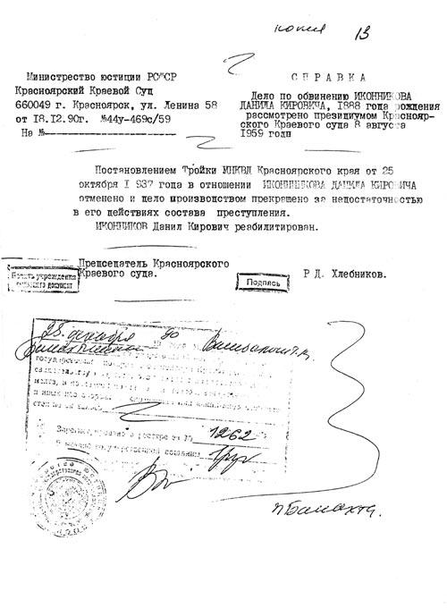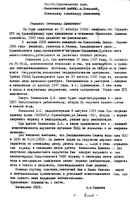 8. Ответ на заявление Иконникова А.Д. в УКГБ по Красноярскому краю в отношении отца Иконникова Д.К.