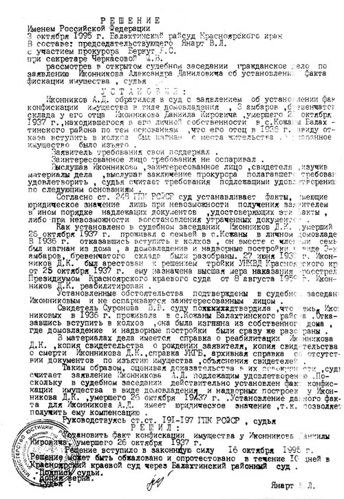 10. Решение Балахтинского райсуда об установлении факта конфискации имущества Иконникова Д.К.