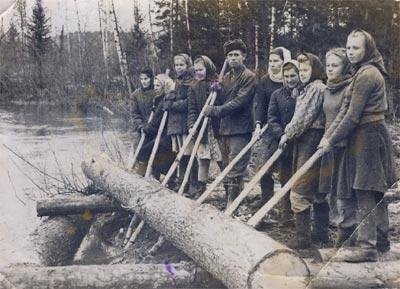 Скатка леса при молевом сплаве. Сортименты скатывали вручную в реку по большой воде. Потом лес плавили до больших рек. Там вязали плоты и гнали до гавани на лесозаводы. В войну и после работали в основном женщины под руководством мастера. Застрявший лес скатывали вагами.