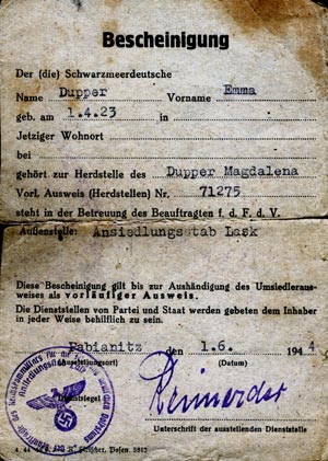 22 апреля бабушку послали в город Кепнитц пасти лошадей, ухаживать за ними. Там бабушка была до 11 июня 1945 года. Пришла младшая сестра Фрида 1930 года рождения и сказала: «Нас высылают домой». Чтобы бабушку отпустили. Бабушка пошла до начальника штаба и сказала, что их отправляют домой и мать без дочери не хочет ехать. Командир сказал: «Девочка, вас домой не пошлют. Вас отправят в Сибирь». А бабушка ответила: «Я поеду лучше в Сибирь, чем оставаться в Польше. Лучше я буду кушать чёрный кусок хлеба и воду, чем оставаться в чужой стране». Командир дал справку, что бабушка освобождена от работы и может ехать. Справка, к сожалению, была утеряна.