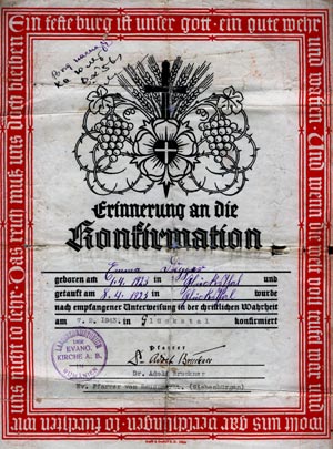 В 1943 году бабушка была конфирмирована в церкви и получила документ подтверждающий это.