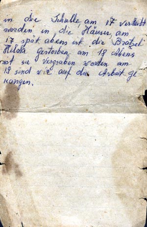 Сестру Лиду забрали сразу, когда приехали, в дом инвалидов. Она умерла там 10 ноября 1944 году, в доме сказали, что она ничего не хотела есть. Но мёртвой они её не видели, они похоронили её сами. 2 ноября умер брат Адам, он был с 1926 года, он с детства сердечником. Жили у него до 22 декабря, потом отправили в посёлок Вальтгаммер, район Вольтштайн. Там жили в маленькой избушке сделанной из брёвен, накрытый соломой в двух комнатах, разместилось 8 человек, две семьи. Работали на хозяина по фамилии Вайс. Коров доила, свиньям картошку варила. Ничего не платили за работу, выполняли чёрную работу. Фронт перешёл через эту деревню 22 января 1945 года, пришла Красная Армия.