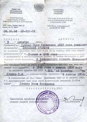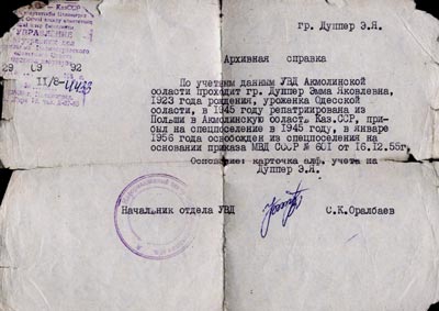 15 августа приехали в Казахстан на станцию Атбасар, выгрузили шесть семей, остальные увезли дальше. На этой станции не было никакого помещения. За людьми приехали две подводы запряжённые быками и одна – лошадьми. Семья Дуппер ехала на лошадях, потому что их было семь человек. У одной женщины – инвалидки было двое детей и сестра. Ещё была семья: женщина с шестью детьми, один меньше другого. Ещё была женщина, у которой было четверо детей. Ещё была семья: женщина с двумя детьми и сестрой. Приехали в Акмолинскую область, Журавлёвский район, село Новодонецкое 17 августа 1945 года.