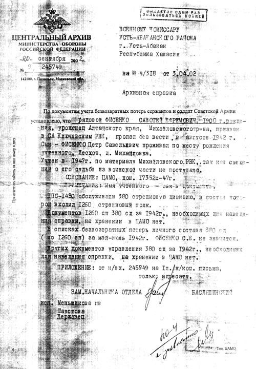 Пытаясь выяснить место гибели, сделали запрос в Центральный Архив Министерства Обороны Российской Федерации. В архивной справке от 20.09.2002 г. было указано: пропал без вести в августе 1942 г.