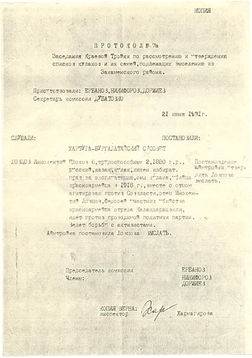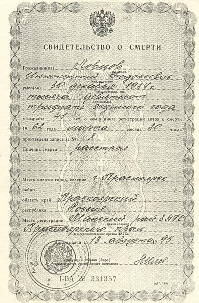 Надежда Прокопьевна обращалась в МВД по Красноярскому краю, где ей выдали документы о реабилитации ее семьи: Иннокентия Федосеевича, Татьяны, Никонора, Федора, Варвары Егоровны. На основании этих документов в том же 1994 г. УСЗН (управление социальной защиты населения) Советского района г. Красноярска выдали удостоверение о реабилитации, где были предусмотрены ряд льгот по закону РФ от 22.12.1992 г. № 4185-1 (см. приложение №2). Умерла Надежда Прокопьевна в 1995 г. в возрасте 92 года, так и не узнав ничего об истинной причине смерти мужа (см. приложение №3). Сын Михаил родился, когда родители находились в ссылке, он по закону считался пострадавшим от политических репрессий, что документально было оформлено МВД по Красноярскому краю. Михаил Иннокентьевич смог выяснить, какая судьба на самом деле постигла его отца. Для этого он обратился в прокуратуру г. Красноярска, где ознакомился с делами, сфабрикованными 21 декабря 1937 г. Решением «тройки» НКВД по Красноярскому краю от 27.12. 1937 г. Ловцову Иннокентию Федосеевичу была назначена высшая мера наказания – расстрел…(см. приложение №4). Постановление о расстреле приведено в исполнение 30. 12. 1937 г. в Красноярске. Через 58 лет, последнему из живых семьи Михаилу, стала известна фактическая смерть отца…