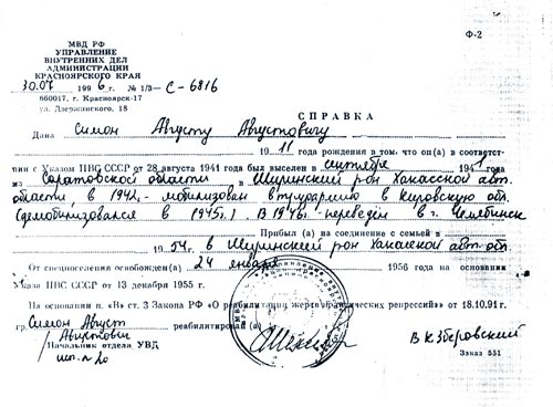 Два столетия спустя, пришел конец их тихой и спокойной жизни: началась Великая Отечественная война. В августе тысяча девятьсот сорок первого года фашисты прорвались к Волге, и Советское правительство, во избежание возможного пособничества российских немцев Германии, сочло необходимым переселить их в Казахстан и Сибирь, где было много свободной земли. Среди других семей, которых постигла сия участь, оказалась и наша семья. В соответствии с Указом Президиума Верховного Совета СССР «О переселении немцев, проживающих в районе Поволжья», семья Симон в спешном порядке в течение двадцати четырех часов была депортирована в Сибирь. В Поволжье им жилось хорошо: работали в колхозе, воспитывали детей, которых было девять человек. Дети росли крепкие, здоровые, учились в школе, поэтому прощание с Волгой было для них трагедией. Переселенцам не разрешили взять с собой необходимые вещи и продукты. Заверили, что все дадут им на новом месте жительства. До ближайшей железнодорожной станции было двенадцать километров. Детей и личные вещи везли в фургонах на лошадях. Взрослые шли пешком. Колонне переселенцев не было конца и края. Все плакали.
