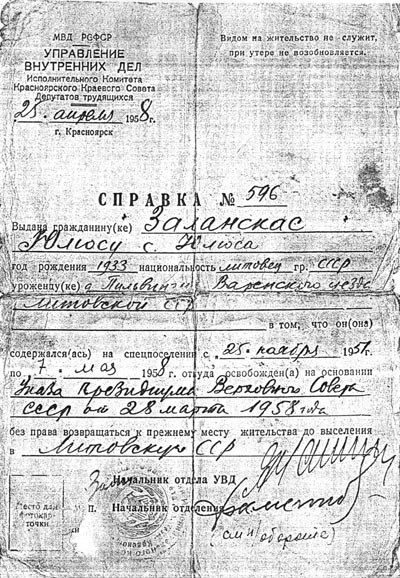 25 апреля 1958 года старших Заланскас вызвали в комендатуру. Им объявили, что семья освобождена, но не имеет права возвращаться в Литву.