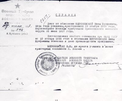 В нашем посёлке проживают и до сих пор те. кто не по своей воле прибыл сюда много лет назад. Среди них - Мироновская Нина Ерофеевна, по национальности -русская, и ее муж. Судьба этой волевой женщины очень сложна и интересна.