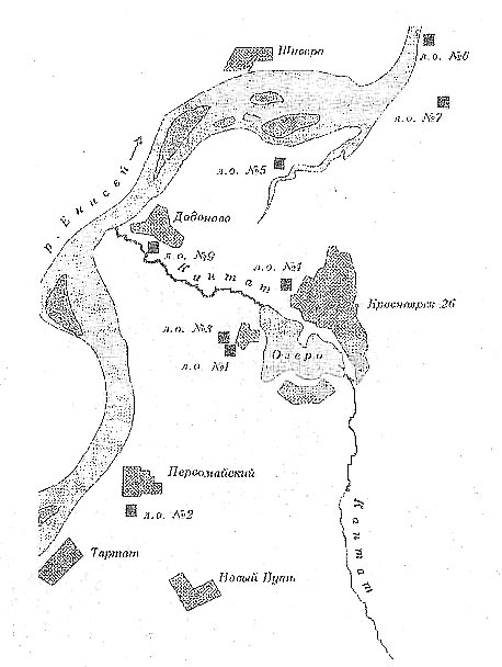 После принятия ЦК КПСС и СМ СССР постановления №836-302 от 26.02.1950 о начале строительства на территории Красноярского края оборонного предприятия атомной промышленности. МВД издает приказ №00336 о создании исправительно-трудового лагеря заключенных «Гранитный» (позже переименованный в «Полянский» ИТЛ) [С.П. Кучин-1994]. В «Полянском» ИТЛ отбывали наказания за разного рода преступления, но в основном это были осужденные за хищение государственной и личной собственности [С.П. Кучин 1999]. «Полянский» ИТЛ просуществовал с 1950-1965 гг. За этот период через него прошло порядка 80483 заключенных. В 1952 и 1953 гг. была максимальная численность заключенных: 25000 и 27314 человек соответственно. На рисунке 2 показано размещение лагерных пунктов и отделений в начальный период строительства. Сейчас в топонимике ЗАТО сохранилось название поселка «Элка». Место размещения лагерного отделения №3 на территории поселка Заозерный. Рисунок 2.
