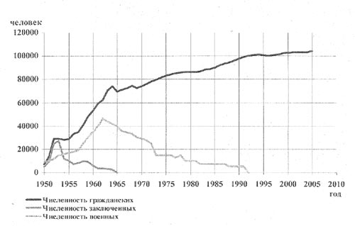 Начиная середины 50-х годов, активно растет численность гражданского населения, хотя по первоначальному проекту она не должна была превышать 16000 человек. Население было задействовано на основном