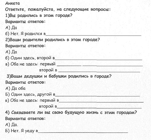 Всего в опросе приняло участие 100 человек. Целью анкетирования являлось сравнить 3 поколения. Откуда они попали в наш город, и выявить отношение моего поколения к будущему нашего города.