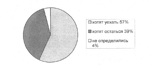 города (работа, жилье), особенно молодое поколение, что подтверждается и моим опросом, не связывают свое будущее с городом, в котором они живут. Так данные опроса показывают: 39% опрошенных хотели бы остаться в городе, жить и работать, 57% хотят уехать и 4% не определились. Рисунок 7.